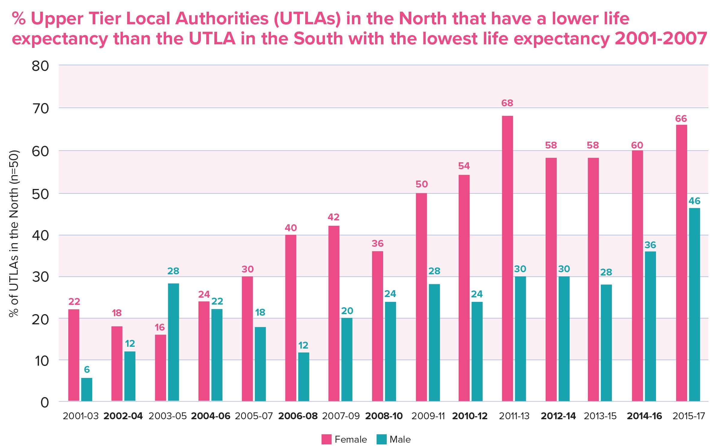 “Health inequalities are an enduring challenge across the North of England with evidence that the health gap between the poorest and the richest has been increasing over recent years. There is a substantial health gap between the North and the rest of England, with average life expectancy two years lower in the North. When looking at Upper Tier Local Authorities (UTLA), 36 out of 50 (72%) of UTLAs for men and 40 out of 50 (80%) for women show a wider gap in life expectancy between the most and least deprived areas than the England average, in comparison to just 11/77 (14%) for men and 6/77 (8%) for women of UTLAs in the South. According to the latest Public Health England data, 33/50 (66%) of UTLAs in the North have a lower female life expectancy than the area with the lowest female life expectancy in the South of England. The corresponding figure is 23/50 (46%) for male life expectancy. Furthermore, 88% of UTLAs in the North have a lower female life expectancy than the England average (86% for males).